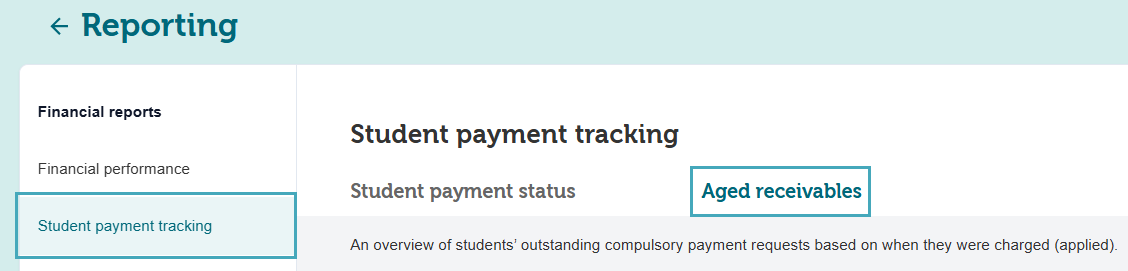 2. Choose Student Payment Tracking from the reporting menu and then select Aged receivables.