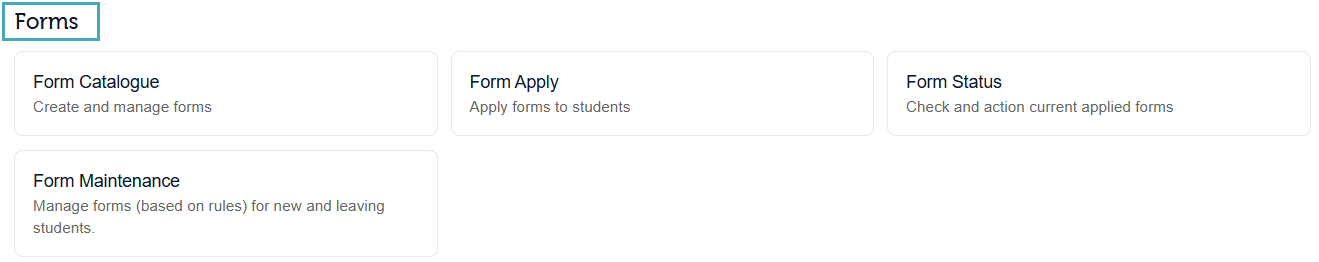 You'll find the Forms cards on your Kindo Admin homepage, sitting just below the existing Kindo Payables and Operations cards.