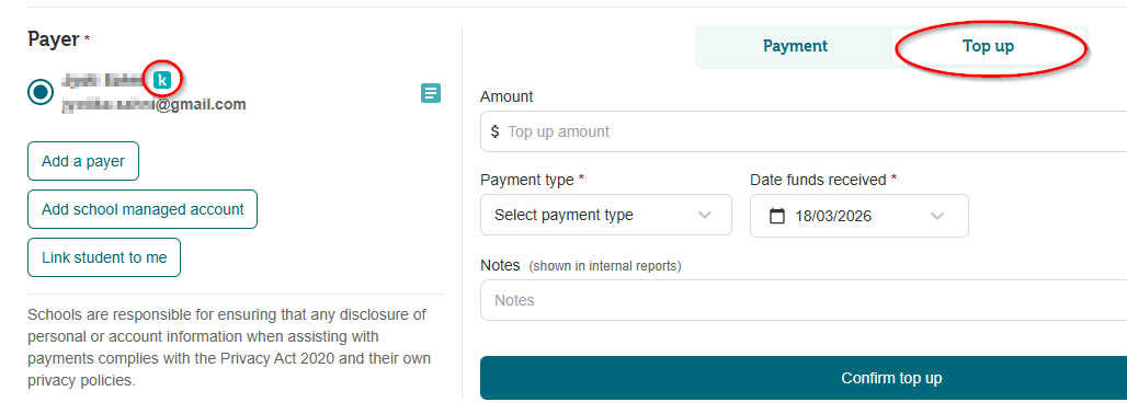 - Enter the necessary details - Amount, Payment type, Date funds received and Notes - and Confirm Top-up. Top-ups will be recorded in your POS Reconciliation and POS History reports - and will be accounted for in your accounting reports from Kindo.