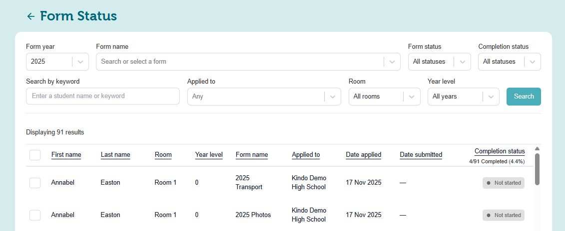 Form Status is where you monitor submissions, follow up with whānau, export or print responses, and manage exemptions.