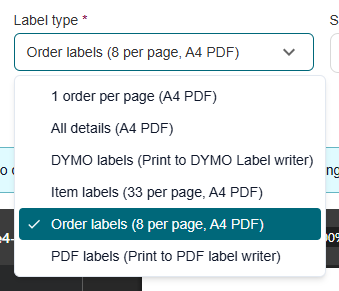In this example, the preview shows the Order labels (8 per page, A4 PDF), based on the selected label type.