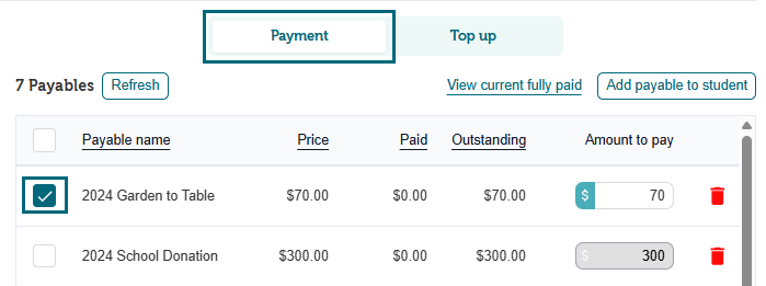 4. In the Payment section, select the item being paid.