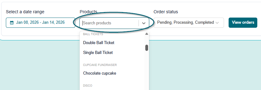 - Use the Product filter to select individual items. i.e. Hockey, Shirts, or Ham Pitas.