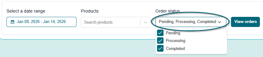 Deselect any of the orders status options you don't want to see: Pending, Processing, Completed. Kindo automatically defaults to showing all the status options.