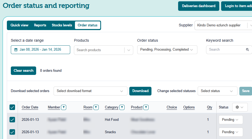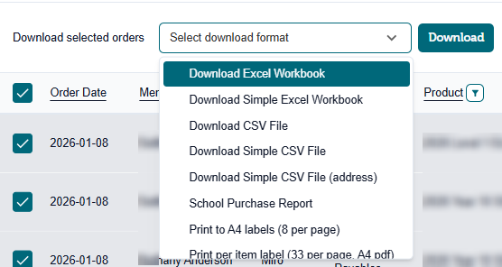 Reporting can be downloaded from the Download selected orders dropdown in a range of Excel/CSV or PDF formats.
