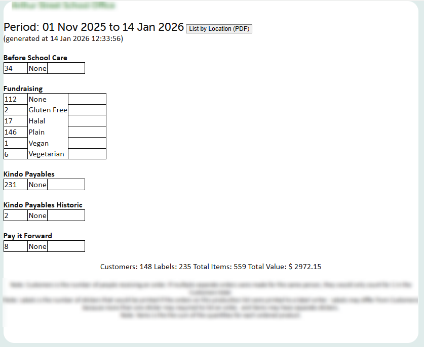 The “List by Location (PDF)” generates a set of pages – one per delivery location/school, which is great for Suppliers who supply to more than one school.