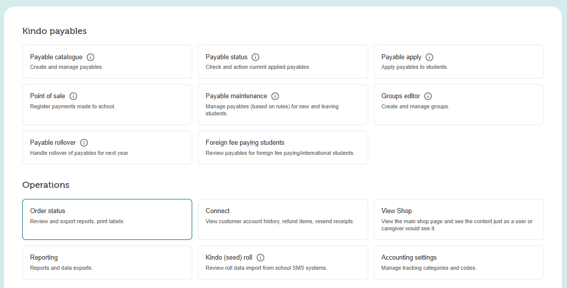 Includes lists of Kindo Payables and Kindo Payables Historic Items as well as Shop items and ezlunch items.