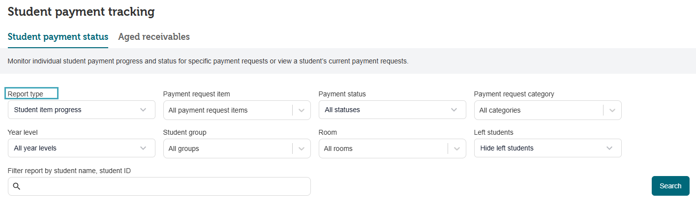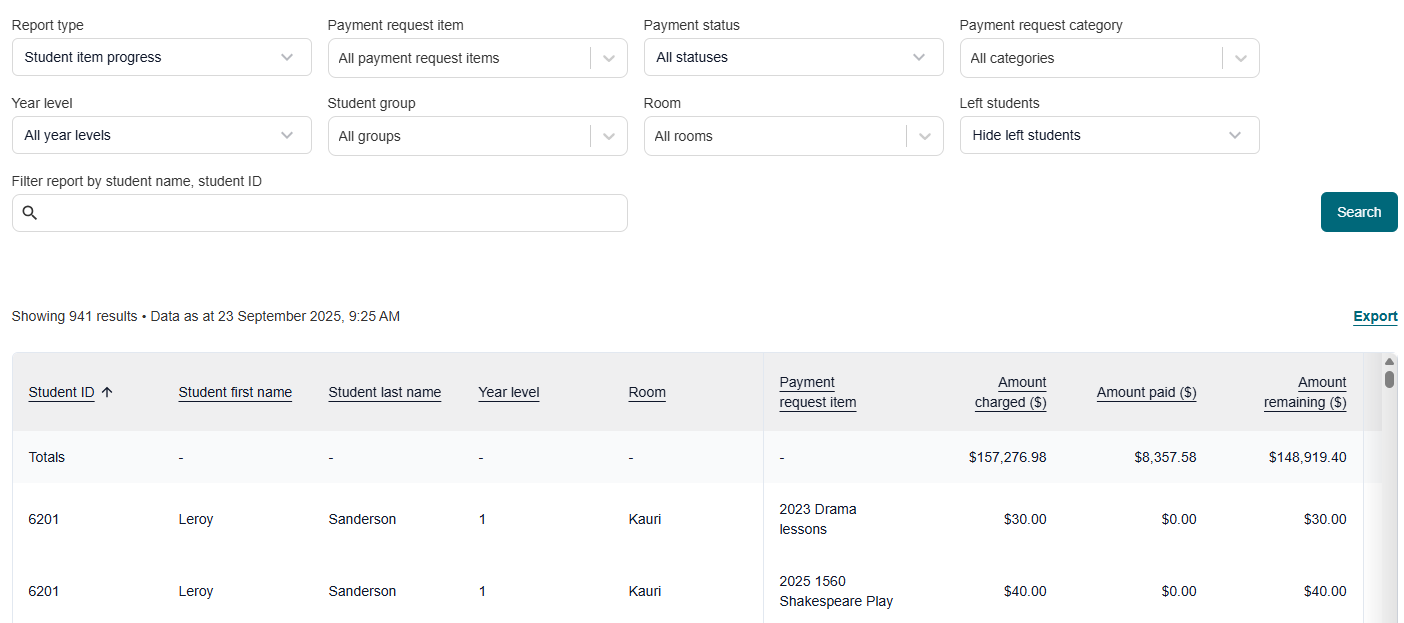 - Student item progress: Student first name, Student last name, Year level, Room, Payment request item, Amount charged ($), Amount paid ($), Amount remaining ($), Latest payment date.
